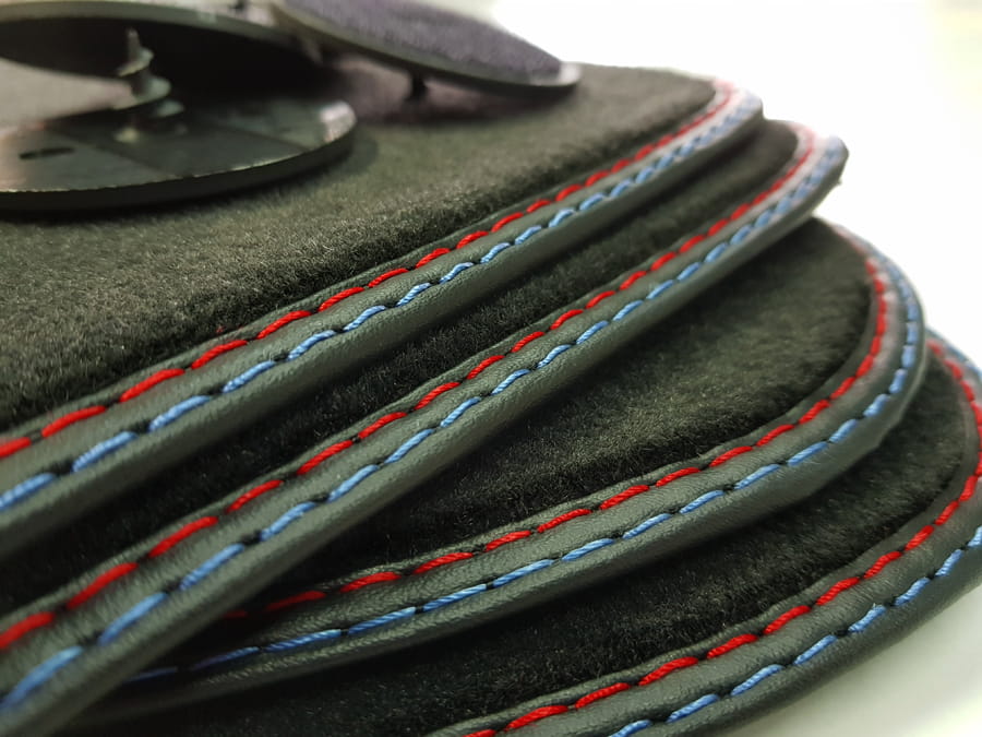 Dywaniki obszyte lamówką i wykończone podwójną nitką kolorze czerwonym i niebieskim
