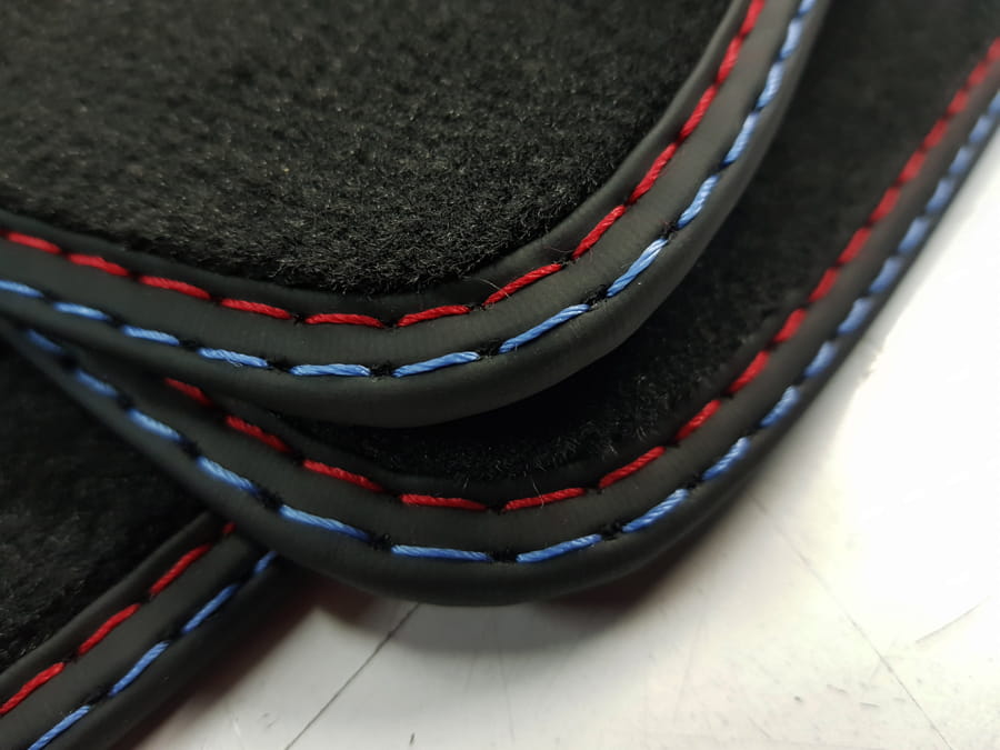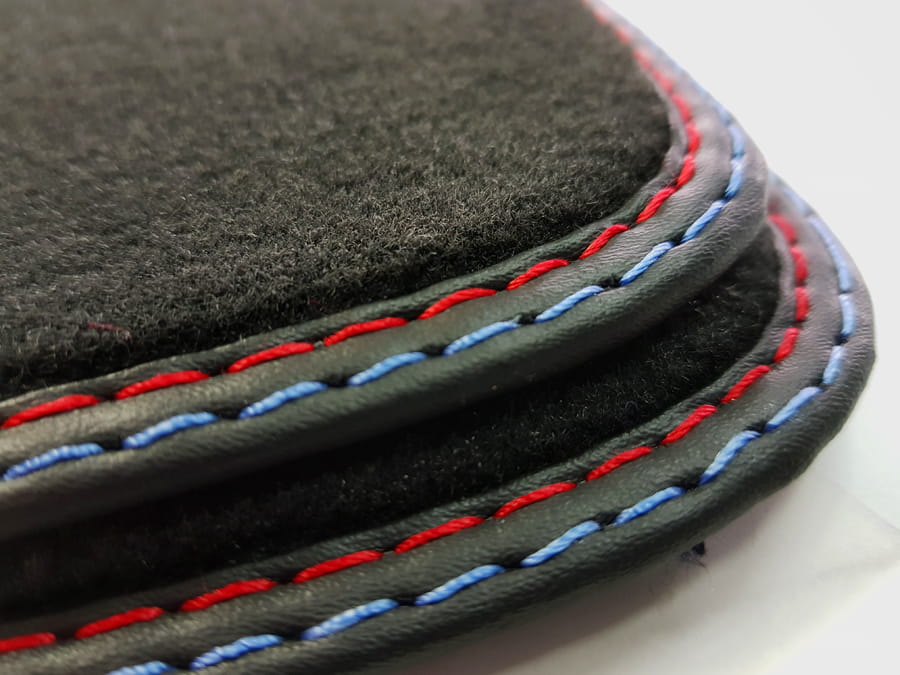 Dywaniki obszyte lamówką wykończone podwójnym ściegiem w kolorze czerwonym i niebieskim.