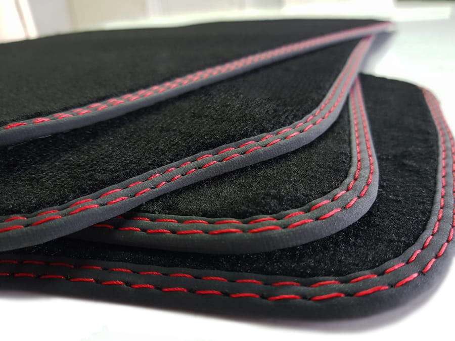 Dywaniki obszyte lamówką wykończone podwójnym ściegiem w kolorze czerwonym.
