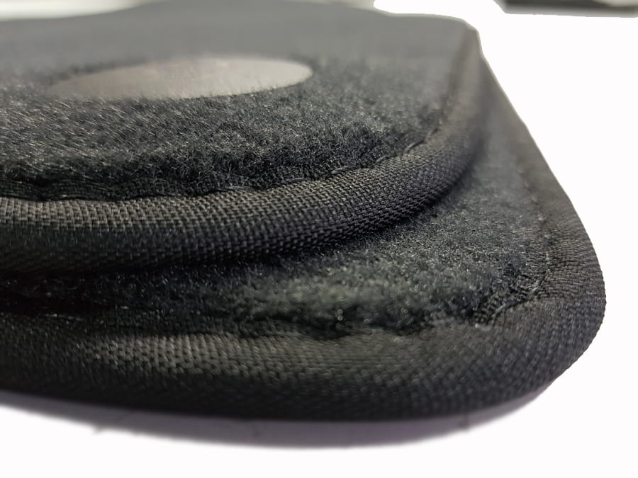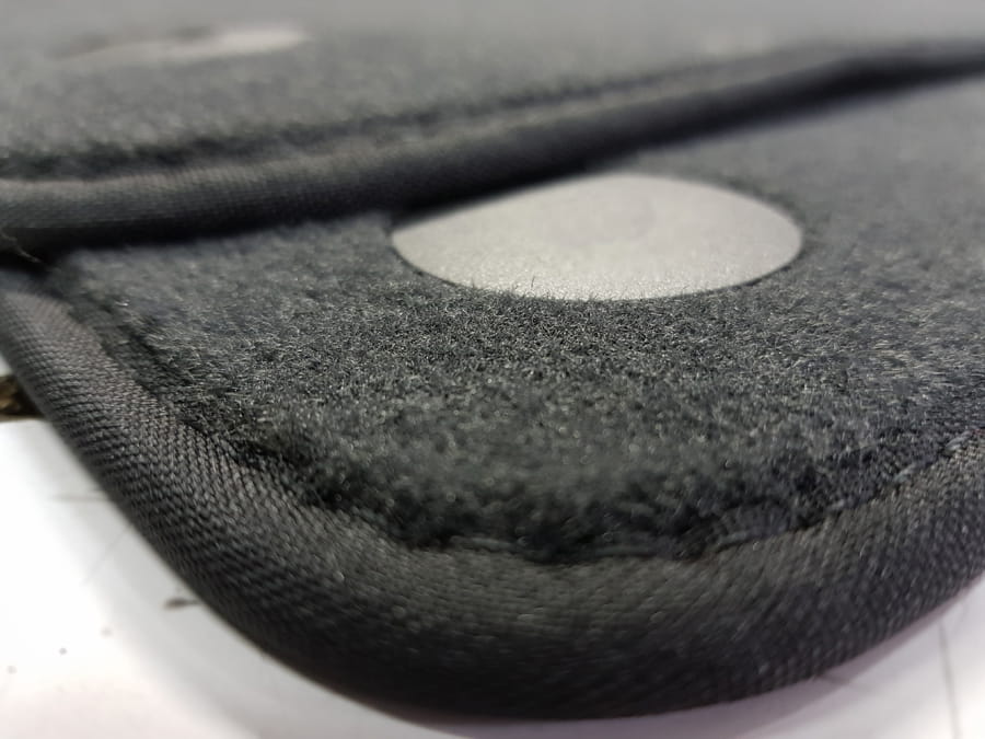 Dywaniki obszyte lamówką i wykończone ściegiem w kolorze czarnym.