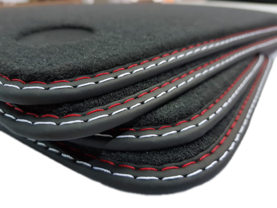 Dywaniki obszyte lamówką i wykończone podwójnym ściegiem w kolorze czerwonym i srebrnym.