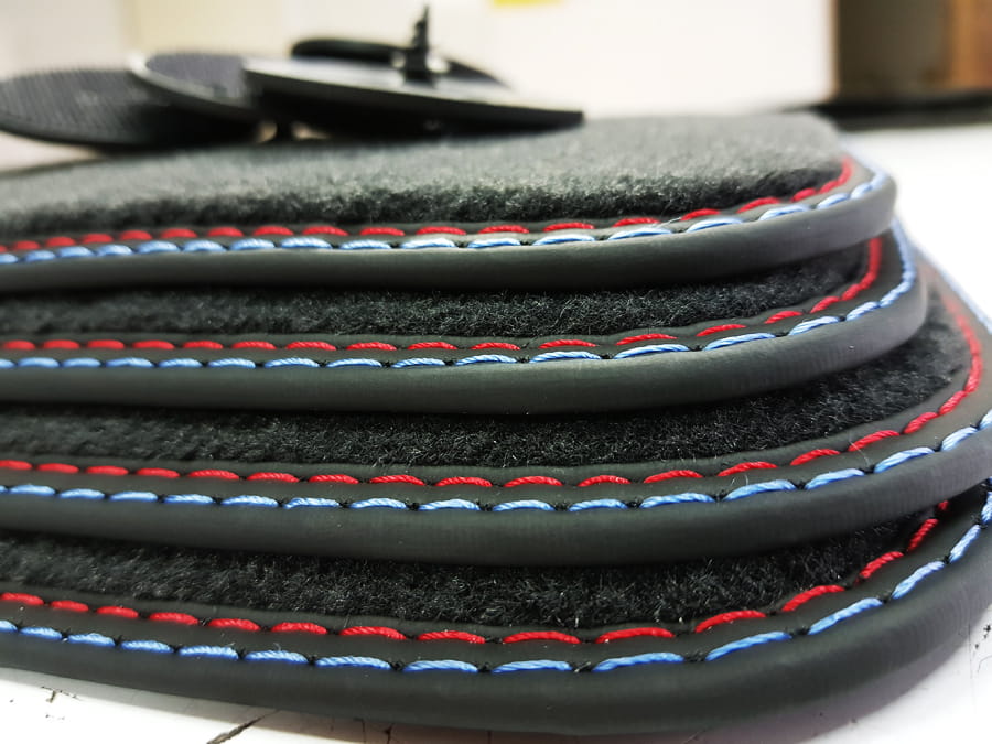 Dywaniki obszyte lamówką i podwójną nitką w kolorze czerwonym i niebieskim