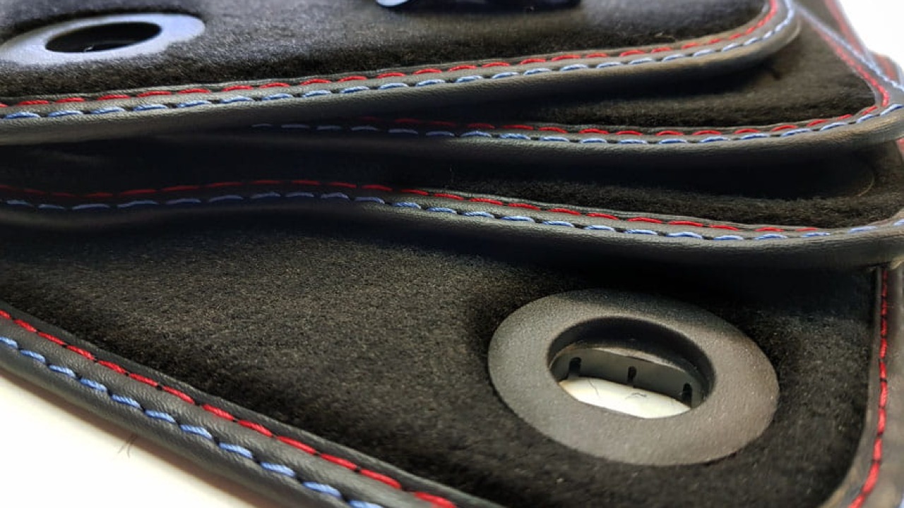 Dywaniki obszyte lamówką i wykończone podwójnym ściegiem kolorach czerwonym i niebieskim.