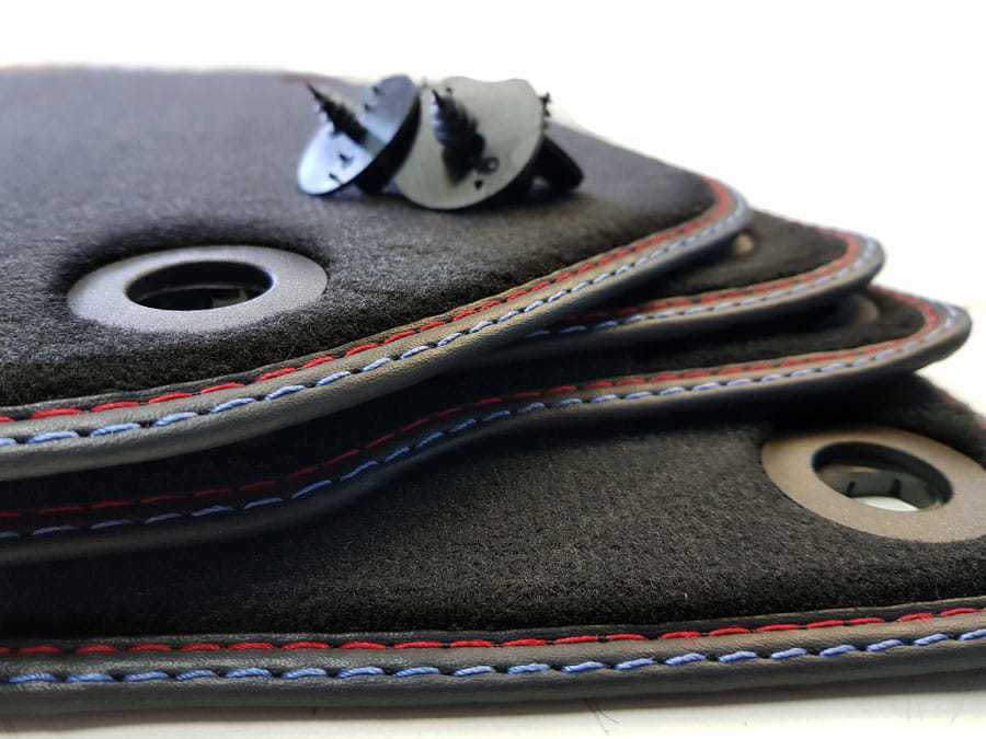 Dywaniki obszyte lamówką i wykończone podwójnym ściegiem kolorach czerwonym i niebieskim.