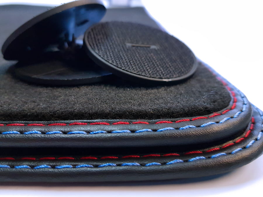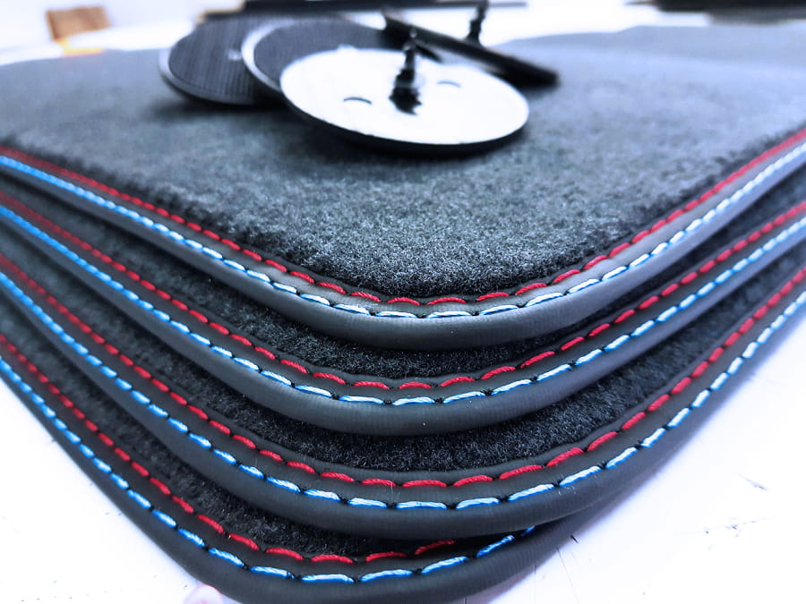 Dywaniki obszyte lamówką i wykończone podwójnym ściegiem kolorach czerwonym i niebieskim.
