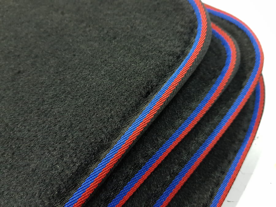 Dywaniki obszyte lamówką w kolorze czerwonym i niebieskim.