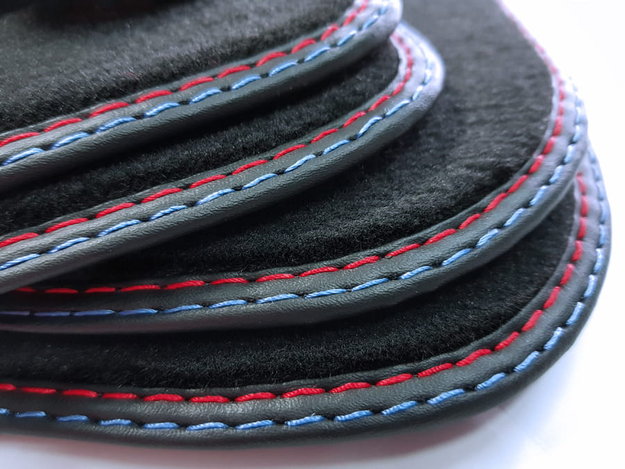 Dywaniki obszyte lamówką i wykończone podwójnym ściegiem kolorach czerwonym i niebieskim.