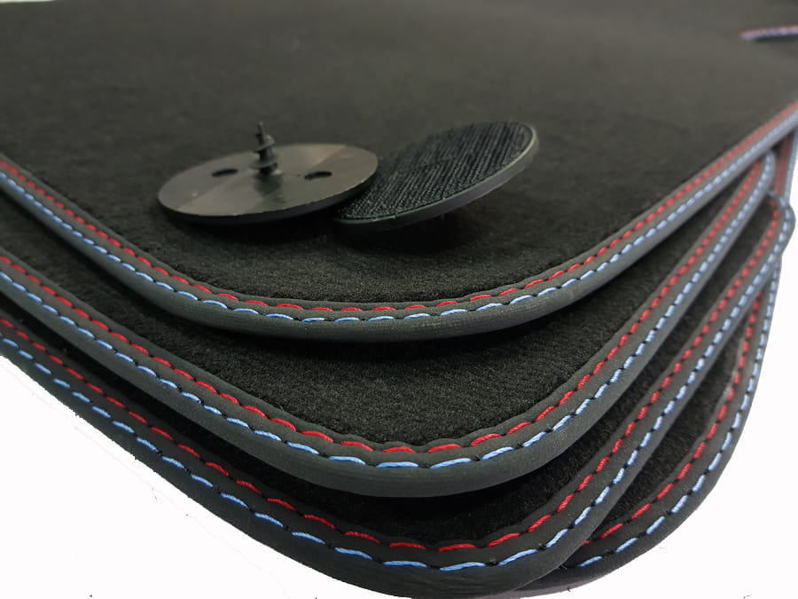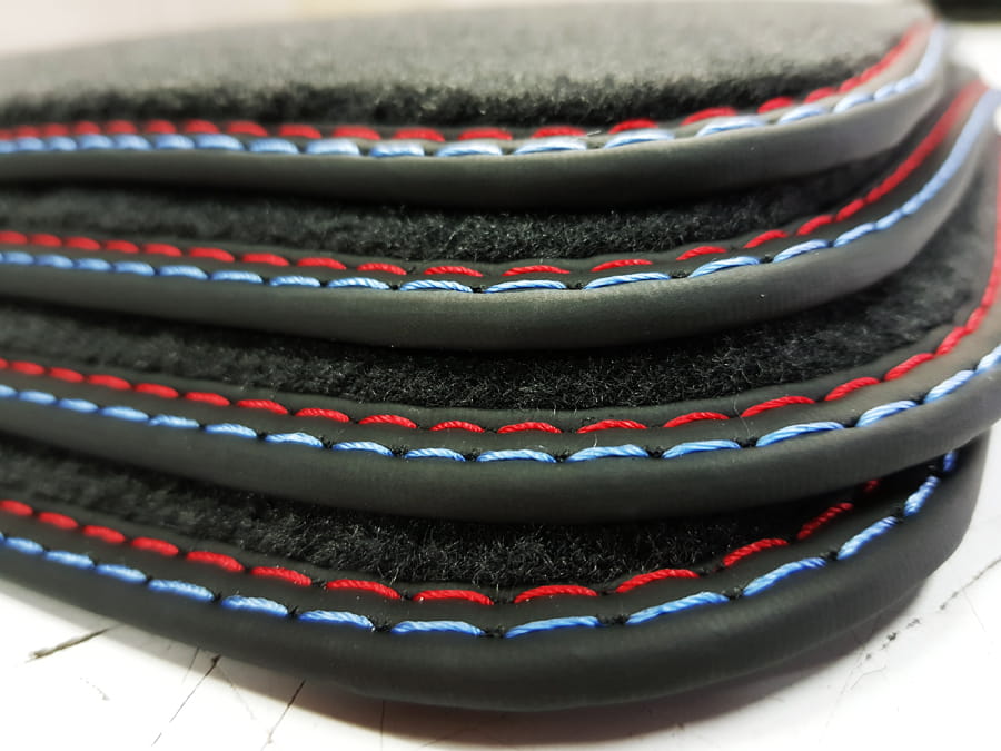 Dywaniki obszyte lamówką i wykończone podwójnym ściegiem kolorach czerwonym i niebieskim.