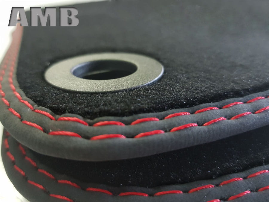 Dywaniki obszyte lamówką wykończone podwójnym ściegiem w kolorze czerwonym.