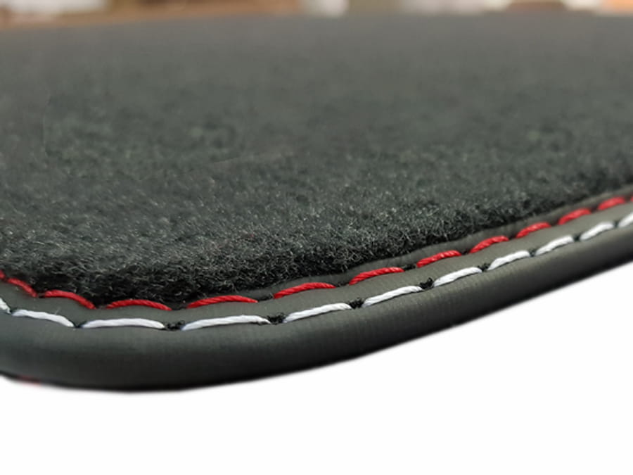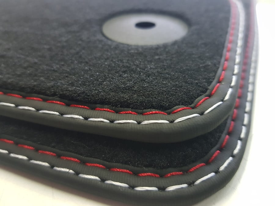 Dywaniki obszyte lamówką wykończone podwójnym ściegiem w kolorach czerwonym i srebrnym