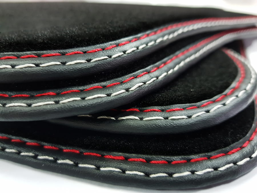 Dywaniki obszyte lamówką wykończone podwójnym ściegiem w kolorze czerwonym i srebrnym