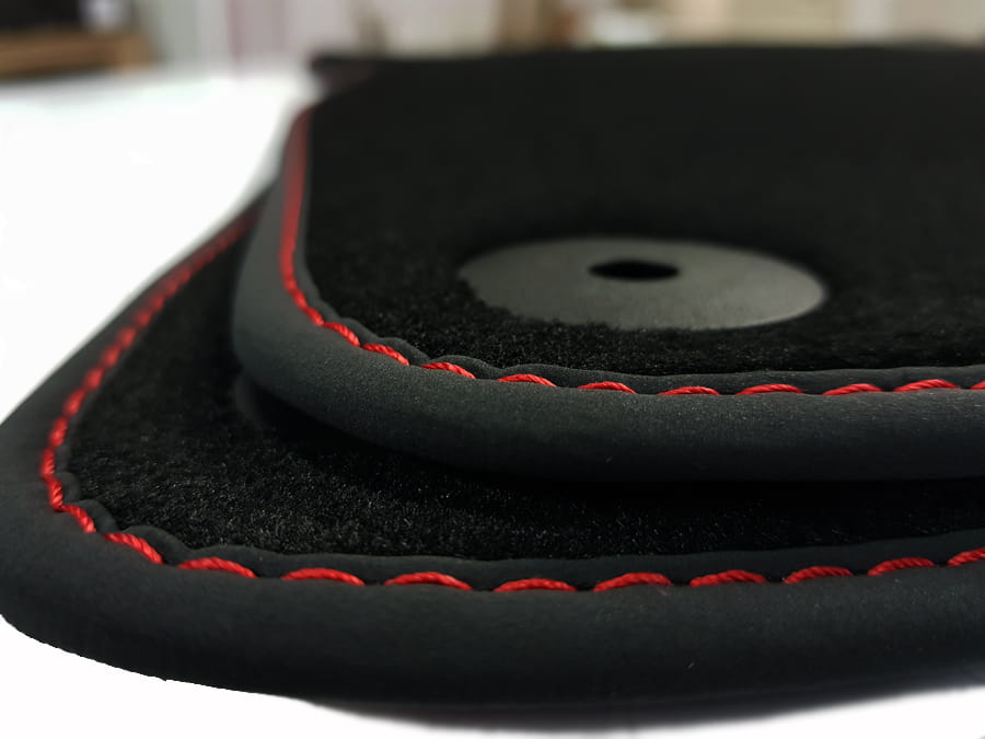 Dywaniki obszyte lamówką i wykończone ściegiem w kolorze czerwonym.