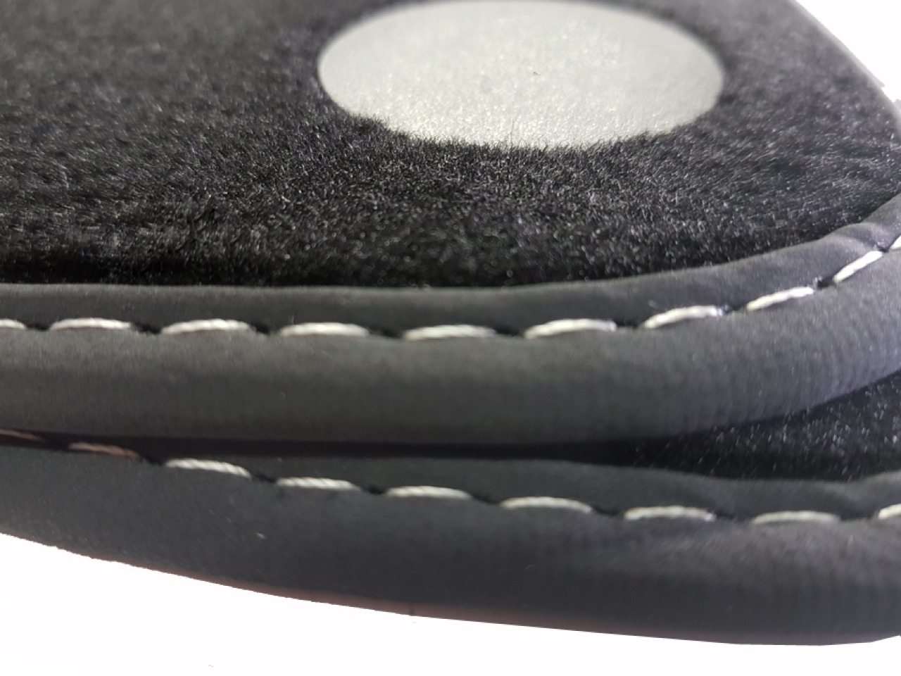 Dywaniki obszyte lamówką i wykończone ściegiem w kolorze srebrnym.