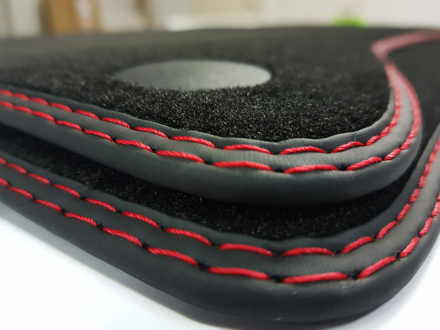 Dywaniki obszyte lamówką i wykończone podwójnym ściegiem w kolorze czerwonym.