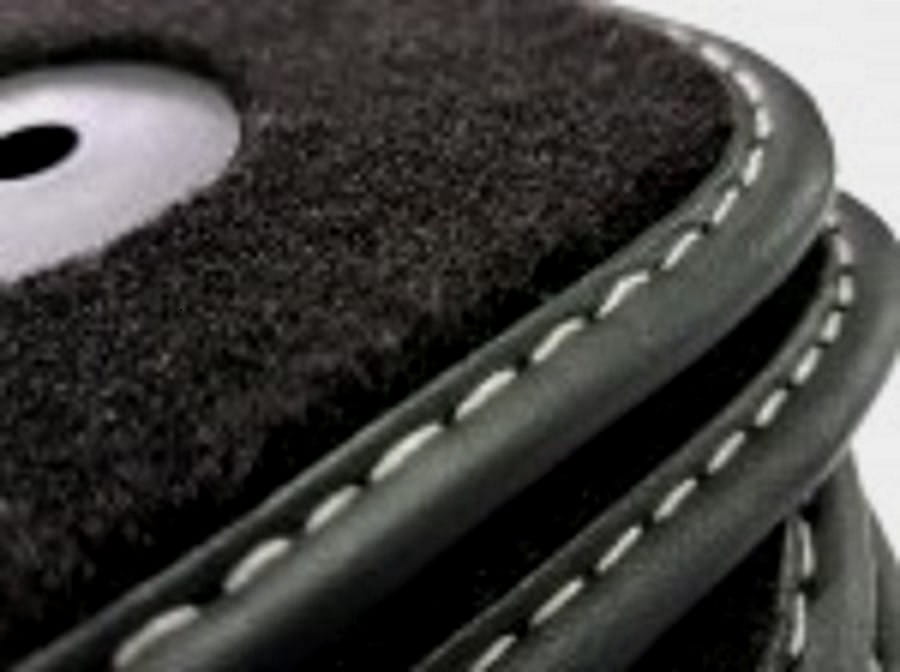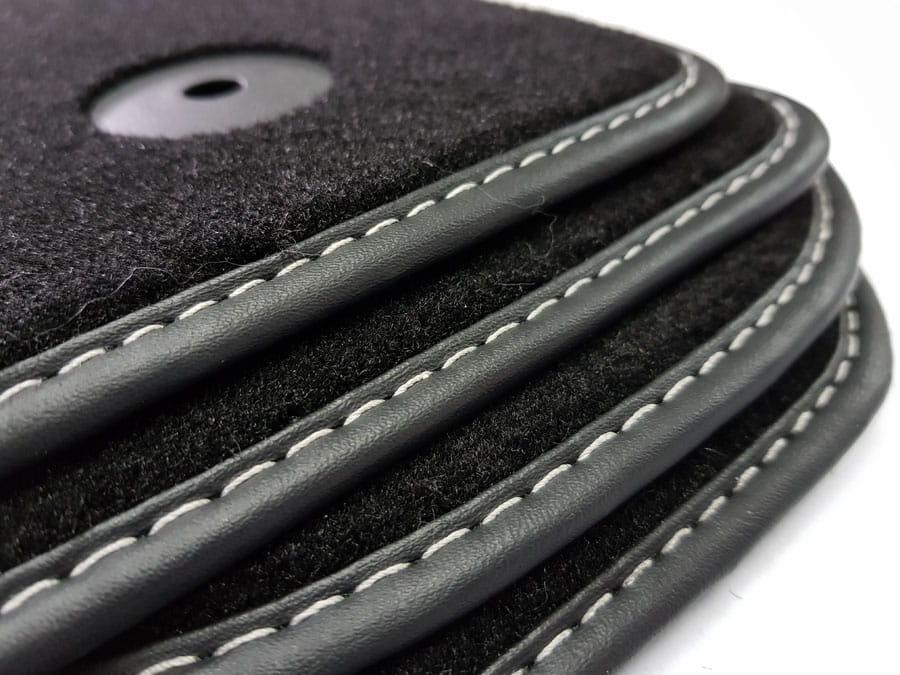 Dywaniki obszyte lamówką i wykończone ściegiem w kolorze srebrnym lub czarnym.