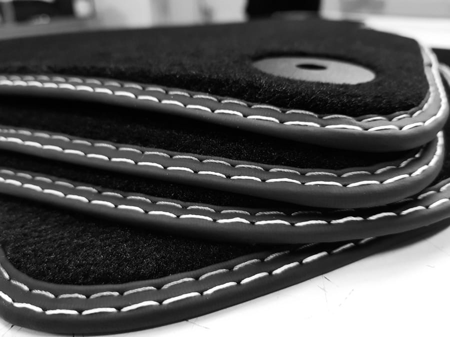 Dywaniki obszyte są lamówką i wykończone podwójną nitka w kolorze srebrnym