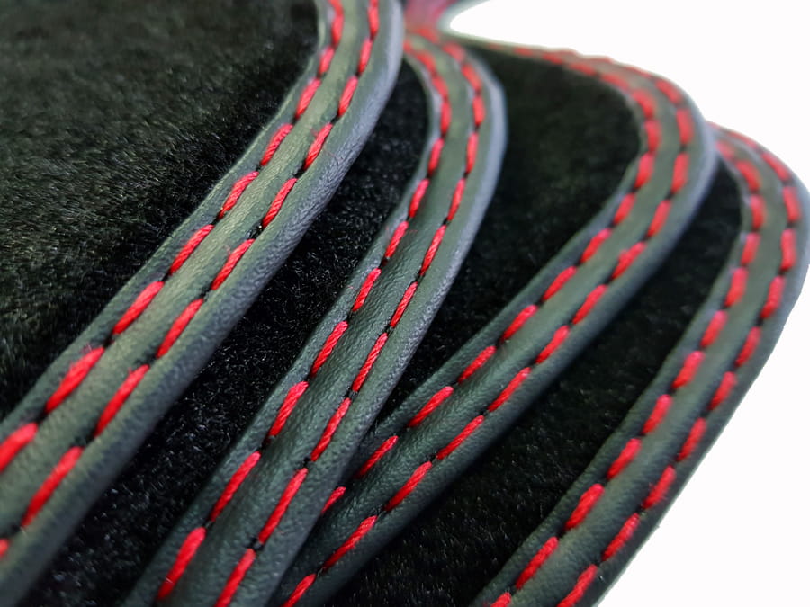 Dywaniki obszyte lamówką wykończone podwójnym ściegiem w kolorze czerwonym.