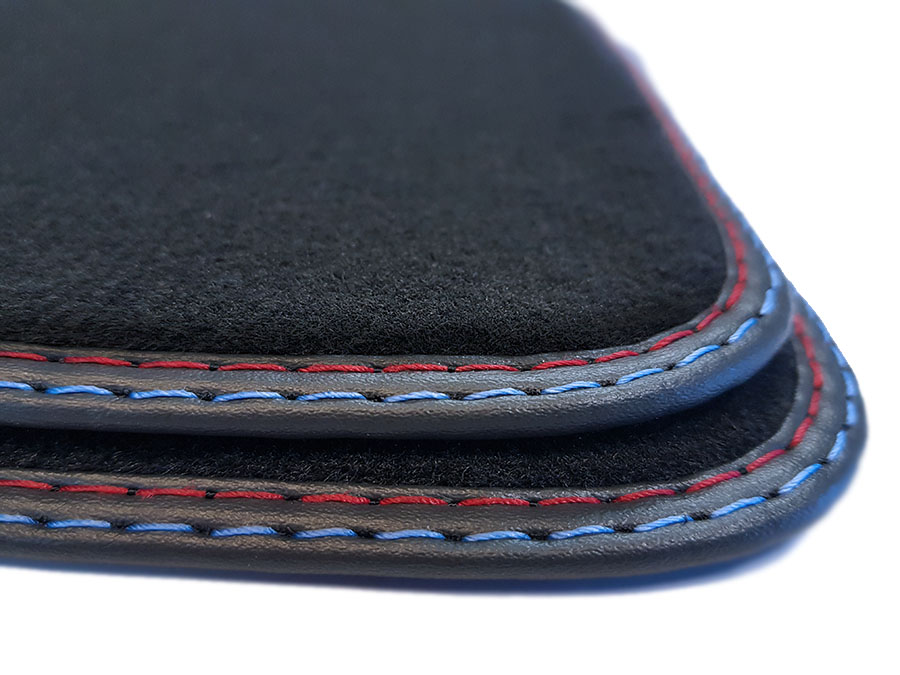 obszyte lamówką i podwójną nitką w kolorze czerwonym i niebieskim