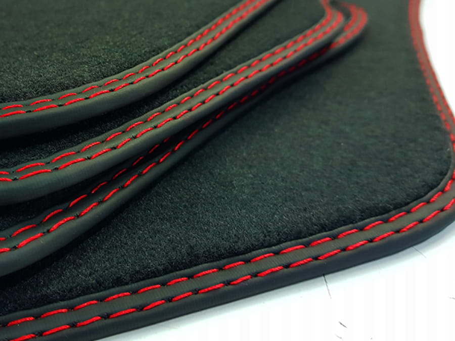 Dywaniki obszyte lamówką i wykończone podwójnym ściegiem w kolorze czerwonym.