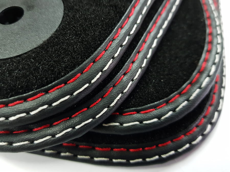 Dywaniki obszyte lamówką i wykończone ściegiem w kolorze srebrnym i czerwonym