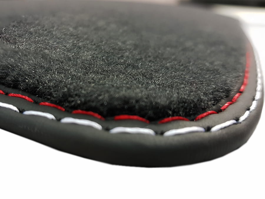 Dywaniki obszyte lamówką i wykończone ściegiem w kolorze czerwono-srebrnym.