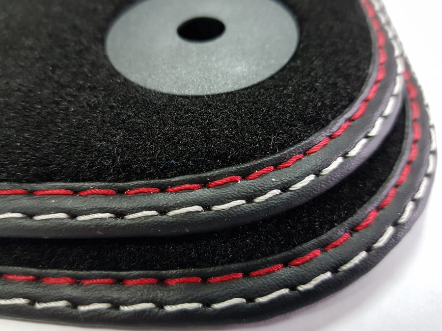 Dywaniki obszyte lamówką wykończone podwójnym ściegiem w kolorach czerwonym i srebrnym