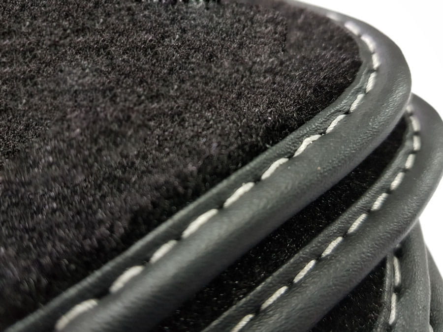 Dywaniki obszyte lamówką i wykończone ściegiem w kolorze srebrnym lub czarnym.