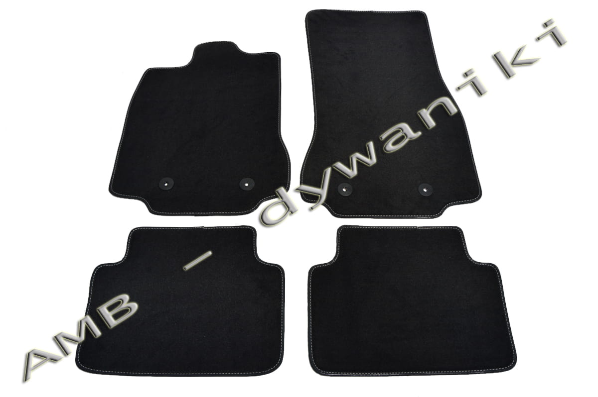 Dywaniki obszyte czarną lamówką wykończone podwójnym ściegiem w kolorach czerwonym i srebrnym