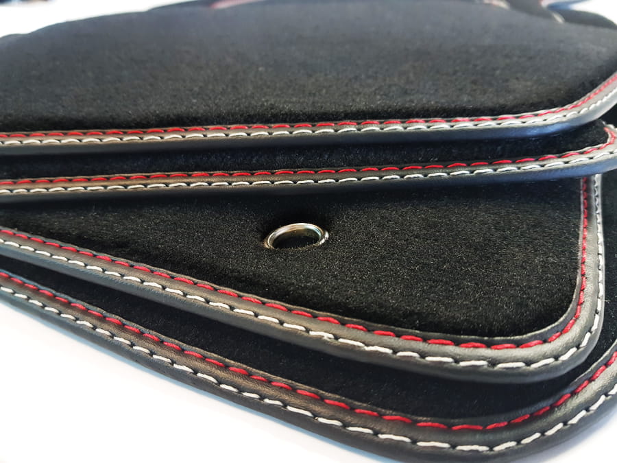 Dywaniki obszyte lamówką i wykończone podwójnym ściegiem w kolorze czerwonym i srebrnym