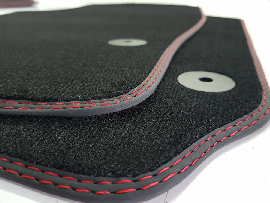 - Dywaniki obszyte są czarną lamówką i wykończone podwójnym ściegiem w kolorze czerwonym