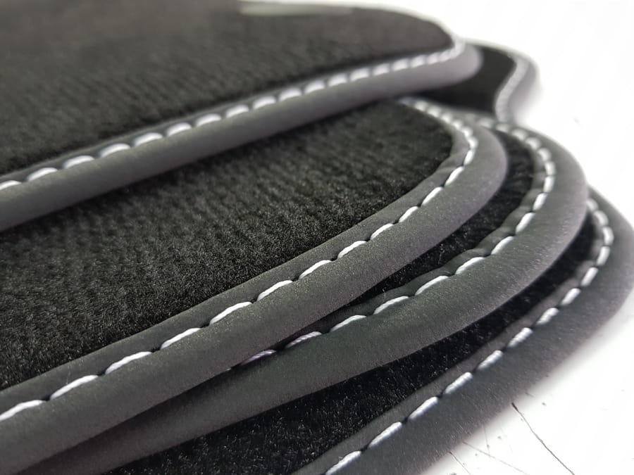 Dywaniki obszyte lamówką i wykończone ściegiem w kolorze srebrnym.