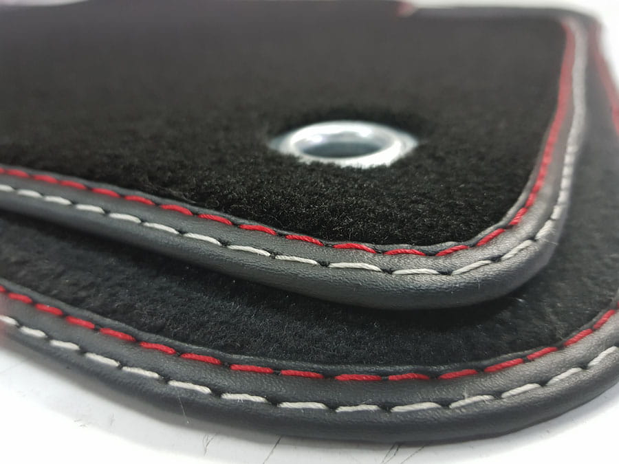 Dywaniki obszyte lamówką i wykończone podwójnym ściegiem w kolorze czerwonym i srebrnym