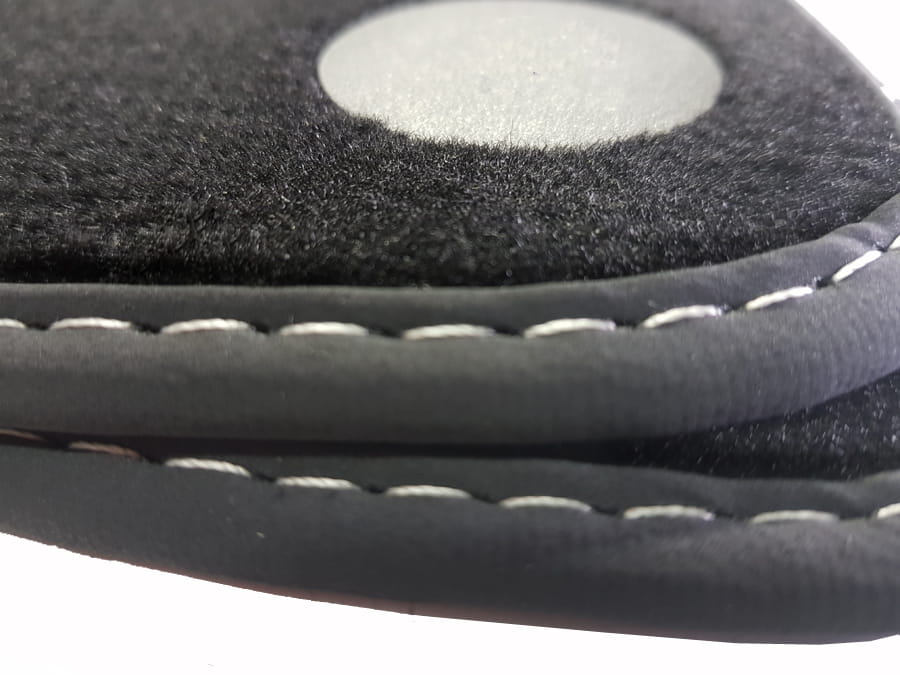 Dywaniki obszyte lamówką i wykończone ściegiem w kolorze srebrnym .