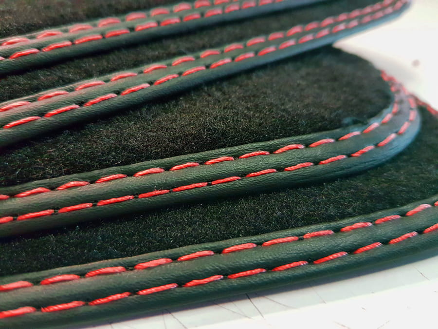 Dywaniki obszyte lamówką wykończone podwójnym ściegiem w kolorze czerwonym.