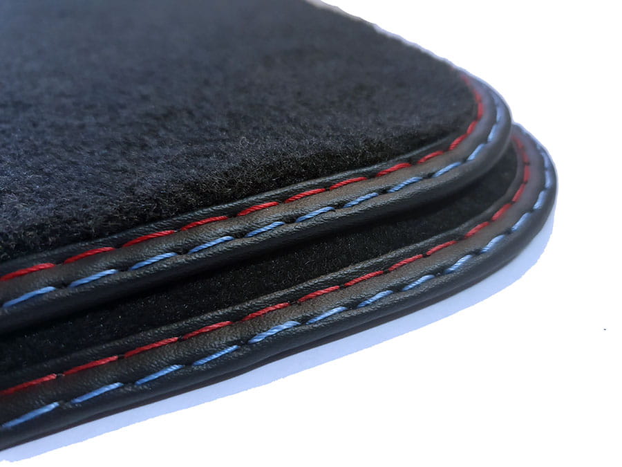 Dywanik obszyty lamówką i wykończony podwójnym ściegiem czerwono-niebieskim.