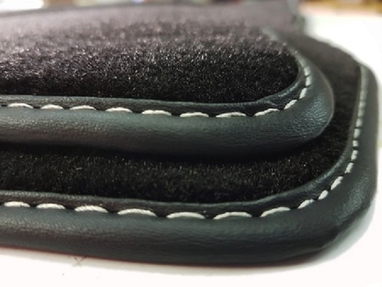 Dywanik samochodowy obszyty jest lamówką i wykończony ozdobnym ściegiem w kolorze srebrnym.