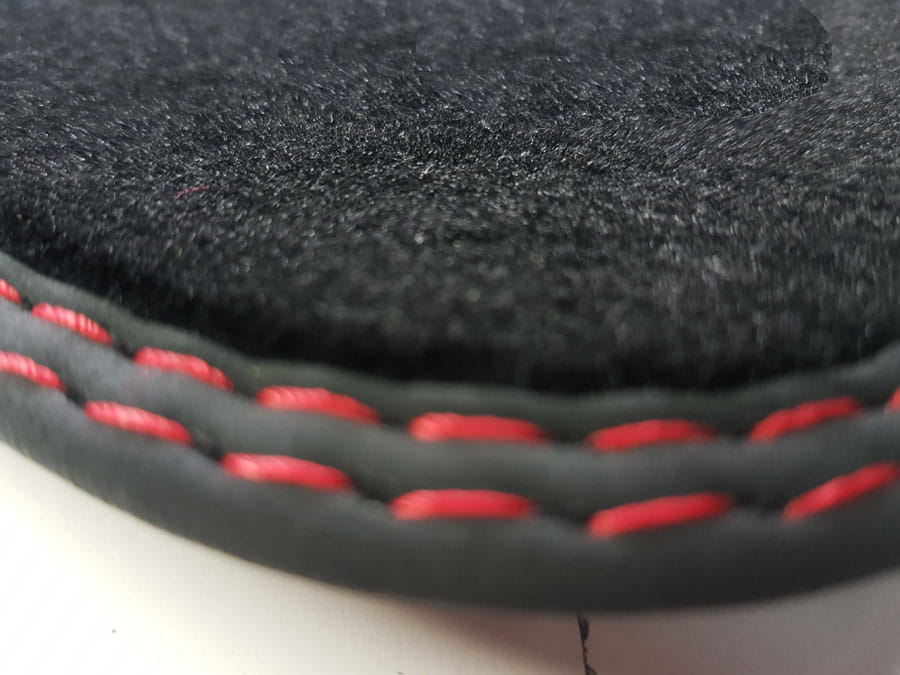 Dywanik obszyty lamówką i wykończone podwójnym ściegiem w kolorze czerwonym.