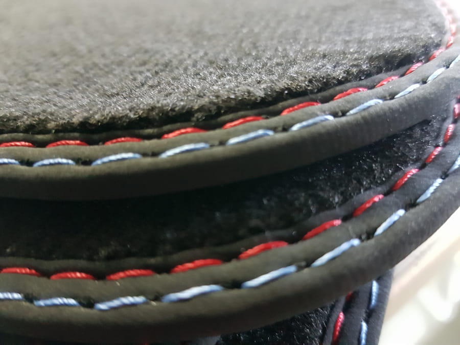 Dywanik obszyty lamówką z nubuku i wykończony podwójnym ściegiem czerwono-niebieskim.