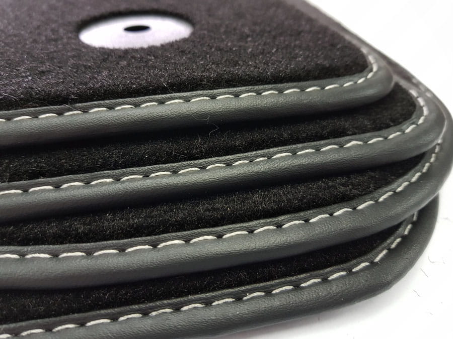 Dywaniki obszyte lamówką i wykończone ściegiem w kolorze srebrnym lub czarnym.