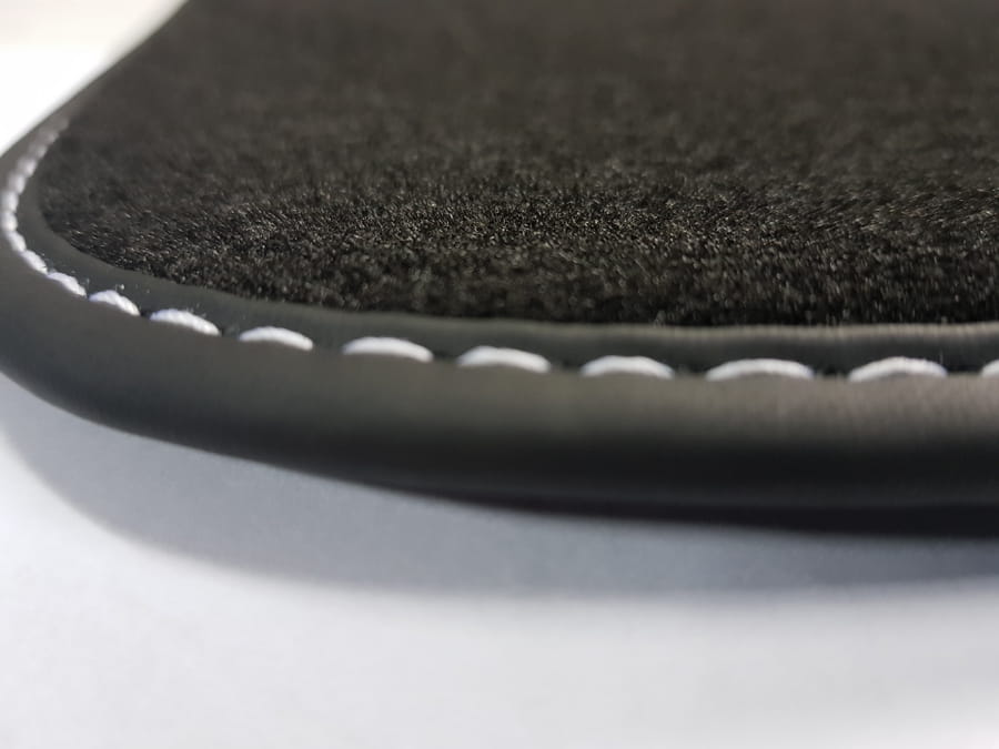 Dywanik samochodowy obszyty jest lamówką i wykończony ozdobnym ściegiem w kolorze srebrnym.