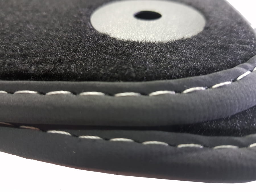 Dywaniki obszyte lamówką pojedynczym ściegiem w kolorze srebrnym.