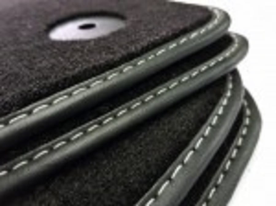 Dywaniki obszyte lamówką i wykończone ściegiem w kolorze srebrnym.