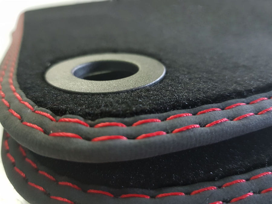 Dywaniki obszyte lamówką wykończone podwójnym ozdobnym ściegiem w kolorze czerwonym