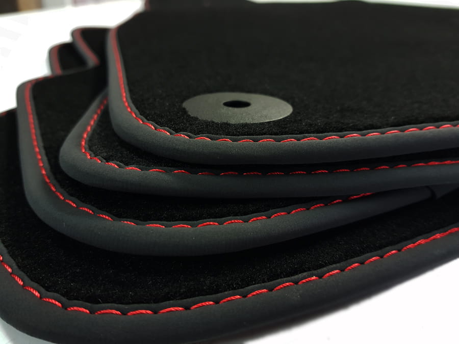 Dywaniki obszyte są lamówką i wykończone ściegiem w kolorze czerwonym.
