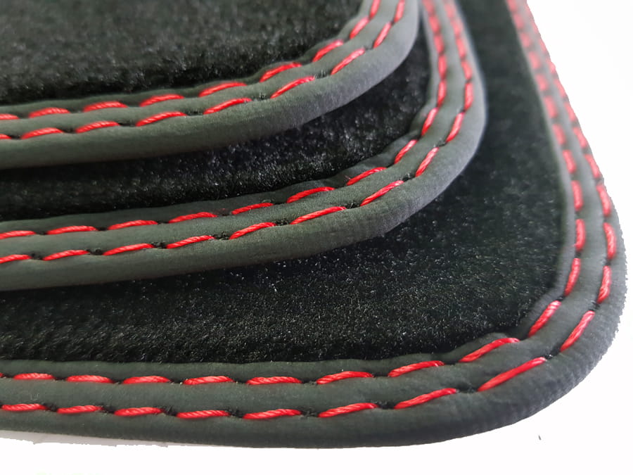 Dywaniki obszyte lamówką i wykończone podwójnym ściegiem w kolorze czerwonym.
